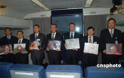 十二月五日,澳門特首何厚鏵(左四)在澳門國際機場親自主禮奧比斯眼科飛機醫院"光明之行"活動開幕典禮。肩負全球救盲使命的奧比斯眼科飛機醫院來澳,將與澳門國際機場合作開展為期三天的"光明之行"參觀活動及慈善拉飛機活動,旨在鼓勵市民關注全球失問題,喚起愛心,救助盲人。 中新社發 史利 攝