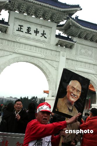 十二月五日,因臺灣教育部門執意拆除臺北“中正紀念堂”牌樓“大中至正”四字引發的風波升級,反對者與支持者在現場爆發數波沖突。圖為一位老者舉著蔣介石畫像,對當局將要拆牌表達強烈抗議。中新社發 董會峰 攝