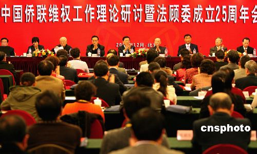 12月8日至9日,中國僑聯維權工作理論研討暨紀念法顧委成立25周年會議在北京召開,會議表彰了近五年來各地僑聯維權工作先進單位和個人。會議就建立維權長效機制,切實維護歸僑僑眷和海外僑胞在國內的合法權利和利益進行理論研討。中國僑聯法顧委是1982年5月6日成立的中國僑聯高層法律服務顧問機構。中新社發 張勤 攝