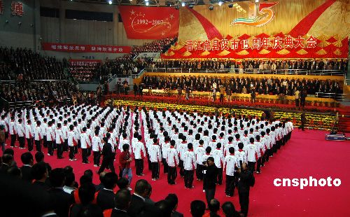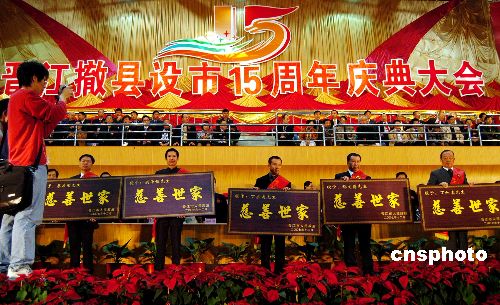 十二月八日, 福建晉江撤縣設市十五周年慶典大會在晉江市祖昌體育館隆重舉行。中央、福建省、泉州市領導,香港、澳門、臺灣地區晉江鄉親社團代表,菲律賓、新加坡、馬來西來、印尼、緬甸等國家的晉江鄉親慶賀團及晉江各界人士共三千八百多人參加了慶典大會。中華海外聯誼會等五十多個單位發來賀電賀信。在慶典大會上,晉江市政府表彰了捐資晉江慈善事業實際到款千萬元人民幣以上的慈善世家、五百萬元人民幣以上的慈善家和三百萬元人民幣以上的慈善大使。中新社發 傅丹丹 攝