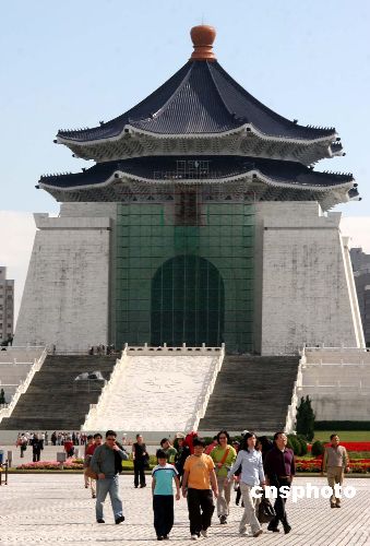 十二月十日,因更換牌匾封館多日的臺北“中正紀念堂”重新對外開放,但主館施工鷹架尚未拆除,由警方派員把守,民眾及游客只能在封鎖區外遠望。中新社發 董會峰 攝