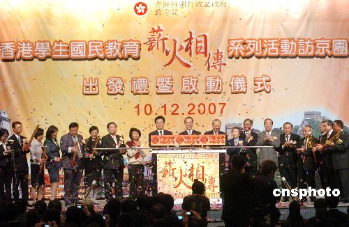 12月10日,香港教育局舉辦的“香港學(xué)生國民教育薪火相傳系列活動(dòng)訪京團(tuán)”在香港會(huì)展中心舉行出發(fā)典禮﹑授旗及啟動(dòng)儀式。香港政務(wù)司司長唐英年及中聯(lián)辦副主任李剛及教育局局長孫明揚(yáng)等為活動(dòng)主持啟動(dòng)儀式。中新社發(fā) 鄧慶樂 攝