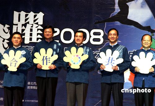 十二月二十七日,“飛躍二00八北臺區域發展成果展”在臺北縣政府舉行,前臺北市市長馬英九及八縣市首長出席。圖為馬英九(中)、臺北市長郝龍斌(左一)、臺北縣長周錫瑋(左二)、桃園縣長朱立倫(右二)、新竹縣長鄭永金等人,身穿臺北縣三峽藍染特色服裝登場。中新社發 董會峰 攝