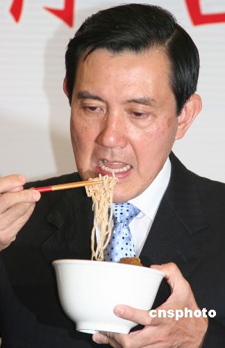十二月二十八日,臺灣高等法院二審宣判前臺北市長馬英九特別費案無罪。馬英九隨后舉行記者會。圖為馬英九吃一位里長送來的豬腳面線,象征去除厄運。中新社發 董會峰 攝