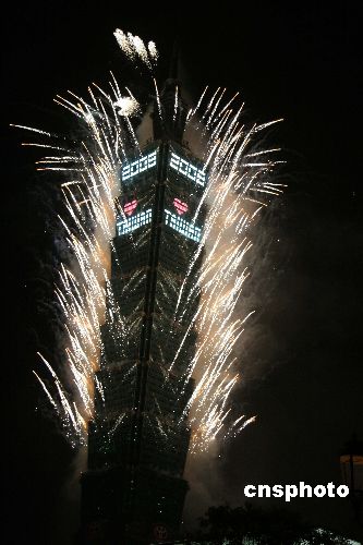 2007年12月31日晚12時許,在數十萬民眾的倒數聲中,世界第一高樓臺北101大樓施放188秒煙花,將臺灣各地的迎新年活動推向高潮。中新社發 孫自法 攝