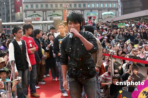 一月六日,臺灣當紅歌星楊宗緯在臺北車站南二門廣場為他即將出版的新專輯預購造勢。圖為楊宗緯抵達現場時受到歌迷的歡迎。中新社發 陳立宇 攝