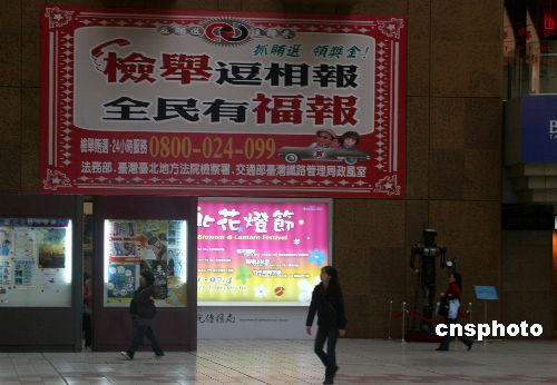 一月七日,距臺(tái)灣第七屆“立委”選舉投票日只有五天,選戰(zhàn)日趨激烈。臺(tái)灣檢方也加強(qiáng)抓賄選的街頭宣傳,圖為臺(tái)北火車站售票大廳內(nèi)懸掛的檢舉抓到賄選可領(lǐng)獎(jiǎng)金的巨幅廣告。中新社發(fā) 陳立宇 攝
