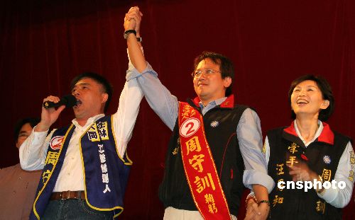 一月十日晚,臺北市市長郝龍斌參加“立委”候選人周守訓拉票造勢晚會,為周參選站臺、打氣。臺灣“立委”選舉在即,選戰已進入白熱化。中新社發 孫自法 攝
