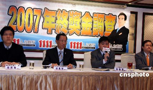 一月二十八日,臺(tái)灣1111人力銀行在臺(tái)北發(fā)布其最新完成的二○○七年終獎(jiǎng)金大調(diào)查,結(jié)果顯示:與上一年度僅一成三受訪者沒有年終可領(lǐng)相比,二○○七年有超過三成上班族確定領(lǐng)不到任何年終,增長一百五十三個(gè)百分點(diǎn)。一成五企業(yè)不發(fā)放二○○七年終獎(jiǎng),不賺錢、景氣差是主要原因。中新社發(fā) 孫自法 攝