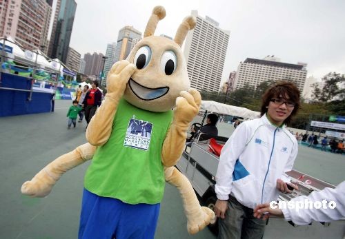 香港渣打馬拉松將在周日舉行,十六日,組委會(huì)在維多利亞公園舉行“為地球而跑—環(huán)保祝賀行動(dòng)”,呼吁推動(dòng)環(huán)保。圖為吉祥物穿梭會(huì)場宣傳助興。中新社發(fā) 洪少葵 攝