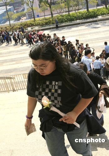 三月二日,已故藝人沈殿霞的追思會《肥姐 我們永遠懷念您》在香港紅磡體育館舉行,近萬名肥姐的親友和市民出席。圖為民眾手捧鮮花排隊入場。中新社發 王麗南 攝