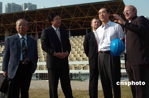 三月四日下午,香港署理行政長官唐英年(右二)與多名局長、警務處長,連同北京奧組委官員參觀由沙田香港體育學院改建而成的奧運及殘奧馬術主要比賽場地和相關配套工程。中新社發 譚達明 攝