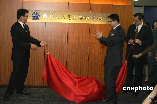 三月十二日,臺灣海基會董事長洪奇昌(右二)、“陸委會主委”陳明通(右一)、海基會秘書長游盈隆(左一)為海基會兩岸人民急難服務中心揭牌。中新社發 曾嘉 攝