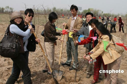 4月5日,由臺(tái)灣成人教育學(xué)會(huì)、商業(yè)教育學(xué)會(huì)以及在天津讀書(shū)的臺(tái)灣籍學(xué)生代表40余人組成的愛(ài)心團(tuán)隊(duì),來(lái)到“愛(ài)心媽媽”王愛(ài)麗創(chuàng)辦的天津市太陽(yáng)村特殊兒童救助服務(wù)中心,參加海峽兩岸“根連根”植樹(shù)活動(dòng),與天津大專(zhuān)院校學(xué)生代表一起種植“友誼樹(shù)”,冀望兩岸同胞的友誼,枝繁葉茂,茁壯成長(zhǎng)。中新社發(fā) 田齊 攝