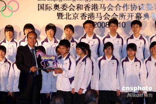 4月10日,香港馬會在北京與國際奧委會博物館簽訂《合作協(xié)議》,為未來成立“香港奧林匹克博物館”,攜手在港進一步宣傳奧運理念、傳播體育精神打下合作的基礎。 雙方同時還簽署了一份《貢獻機構協(xié)議》。根據(jù)該協(xié)議,馬會將向國際奧委會博物館進行捐贈以支持并宣揚奧林匹克運動。圖為在儀式上香港學生向北京奧組委贈送禮物。中新社發(fā) 任海霞 攝