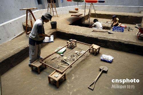 十三行博物館位于臺北縣八里鄉淡水河海口交界處的南岸,面積約為62500平方公尺,在1989至1992年間,因為在遺址上興建八里污水處理廠,引發附近居民以及學者抗議。在社會輿論的聲援下,當局一邊開挖古物、一邊興建污水處理廠,最後在廠內保留出一塊古跡保護區,并在污水處理廠旁建造十三行博物館,保存出土文物。 1957年地質學者林朝綮在這里發現史前的煉鐵遺跡,同時亦發現許多史前陶片、石支腳與凹石等,因而判斷此處為史前遺址,并依據該地地名將它定名為十三行遺址。十三行人是目前臺灣唯一確定擁有煉鐵技術的史前居民,可能是臺灣平埔族凱達格蘭人的祖先。十三行文化屬于北臺灣地區的金屬器時代,時間大致從2300年前開始,到漢人進入本地區之后才結束。圖為重現當年考古發現的場景。中新社發 杜洋 攝
