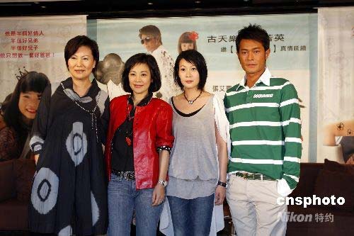 4月23日,張艾嘉(左二)帶著奶茶劉若英(右二)、古天樂,以及片中客串的港星陶敏明在臺北為愛情結晶喜劇《一個好爸爸》造勢。本片由成龍親自監制,是張艾嘉繼《20.30.40》后籌備三年的執導力作。她在此片突破常規染指黑幫的花花世界,用豐富和幽默真摯情感打動觀眾,成為導演生涯中最有創作力一次。男女主角古天樂、劉若英飾演一對經歷廿年愛情試煉的夫妻,激情有默契,雋永而清新。《一個好爸爸》將于4月25日在臺灣公映。中新社發 杜洋 攝