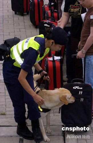 五月十日,香港落馬洲海關警犬基地開放予公眾參觀。圖為警犬進行模擬搜查違禁品的工作。落馬洲海關警犬基地于二零零五年正式啟用,有四只警犬駐守,為出入境管制站及貨柜碼頭進行緝毒和搜查其它違禁品的工作。中新社發(fā) 譚達明 攝