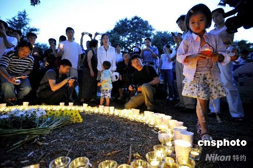 當(dāng)?shù)貢r間五月十七日晚,美國加州硅谷華人在山景城街心公園舉行燭光祈禱儀式,悼念汶川大地震的死難同胞,祝愿仍處困境的災(zāi)民平安,并向奮戰(zhàn)在抗震救災(zāi)第一線的軍人和醫(yī)護人員致敬。中新社發(fā) 陳鋼 攝