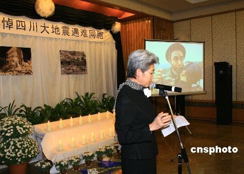 當地時間19日下午2時28分,旅英華人華僑、中資機構和留學生代表在中國使館內,和中國外交官一起默哀三分鐘,沉痛悼念在四川大地震中遇難的同胞。圖為傅瑩大使在哽咽著致悼詞。