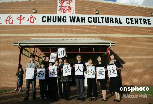 當?shù)貢r間5月25日下午四時,西澳大利亞華人聚集在中華文化中心,舉辦“祈福零八,平安中國”活動為四川地震募集善款。其中,來自河南同鄉(xiāng)會的華僑打出了“四川——西澳華人的牽掛”的標語。中新社發(fā) 高周丹 攝