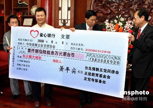 6月6日,臺(tái)灣佛教正覺(jué)同修會(huì)、正覺(jué)教育基金會(huì)、正覺(jué)寺籌備處等在北京國(guó)家宗教事物局向四川地震災(zāi)區(qū)捐獻(xiàn)1863萬(wàn)元新臺(tái)幣,以幫助四川災(zāi)區(qū)受傷人員、學(xué)校重建、寺廟修繕等。圖為捐贈(zèng)儀式上,臺(tái)灣佛教正覺(jué)同修會(huì)董事長(zhǎng)張公仆先生(左二),向國(guó)家宗教事物局副局長(zhǎng)蔣永堅(jiān)(右二)遞交支票樣本。中新社發(fā) 宋吉河 攝