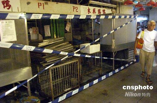 六月八日,深水(左土右步)保安道街市雞檔暫停營業。該街市三個雞檔,在早前例行抽驗雞糞的程序中發現H5N1禽流感病毒,香港政府昨午實時采取八項措施,除禁止該街市所有雞檔販賣外,還立即銷毀街市內全部雞只。中新社發 譚達明 攝