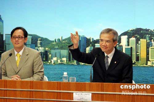 香港奧運馬術公司行政總裁林煥光(右)和香港中旅社發言人吳熹安六月十日舉行新聞簡報會,宣布香港再獲北京奧組委分配六萬張奧運馬術門票,將于六月十二日開售。香港中旅社將受委托作為門票銷售的票務代理。中新社發 黎金良 攝