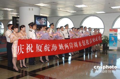 7月4日,作為首架降落臺北松山機場大陸民航客機,從松山乘載202位客人返抵廈門高崎場后,廈航MF-881班機全體駕乘人員合影慶賀往返分別以80分鐘時間正點執乘。機長沈志群介紹,航班抵達臺北松山機場時,受到當地各界以“迎風洗塵”為主題的禮遇迎接。中新社發 鄭祚聲 攝