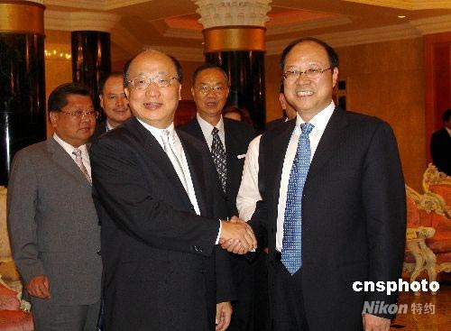 七月七日中午,中共中央臺辦、國臺辦常務(wù)副主任鄭立中(前右),在廈門親切會見搭乘周末包機(jī)從臺中首航廈門的臺中市市長胡志強(qiáng)(前左)一行。圖為兩人熱烈握手致意。中新社發(fā) 楊伏山 攝