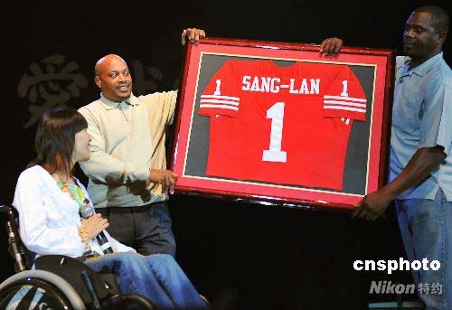 當地時間七月十九日,特意趕來參加舊金山華人華僑舉辦的《唱響奧運 愛我中華》音樂會的奧運火炬手桑蘭,意外收到舊金山著名的四十九人棒球隊繡有桑蘭名字的一號球衣。中新社發 陳鋼 攝