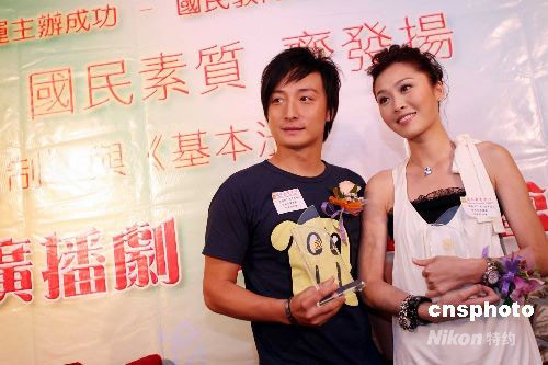 由香港政制及內地事務局贊助,國民教育中心策劃,有關基本法及發揚奧運精神系列活動即將在香港推出。九月二十日,參與“一國兩制”與“基本法”廣播劇演出的影視紅星方力申、周麗淇出席記者會與青少年分享心得。中新社發 洪少葵 攝