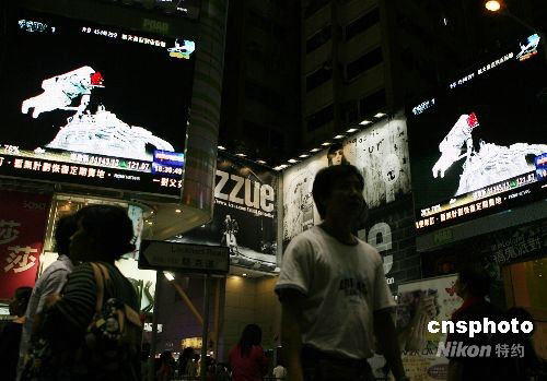 北京時間二十七日下午四點五十九分,神舟七號航天員翟志剛成功返回軌道艙,這標志著中國歷史上第一次太空行走成功完成。圖為香港市民在銅鑼灣鬧市通過大屏幕關(guān)注這一歷史時刻。中新社發(fā) 武仲林 攝