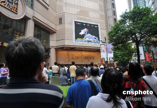九月二十七日,中國“神舟七號”航天員翟志剛歷史性作漫步太空,成為中國航天事業(yè)的新里程碑。在香港銅鑼灣時(shí)代廣場的大型戶外電視屏幕下,眾多市民駐足觀看電視直播。圖為航天員翟志剛漫步太空期間并揮動國旗,以及收集飛船外的太空實(shí)驗(yàn)樣本。中新社發(fā) 鄧慶樂 攝