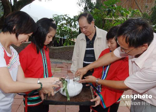 十月二日,參加“2008·陽光海峽”兩岸快樂小天使活動營的兩岸小天使在日月潭畔舉行換水儀式。來自福建閩江的水和臺灣日月潭的水,在兩岸小天使的見證下溶為一體。圖為該活動營領隊、福建省廣播影視集團電視少兒頻道總監覃曉清(左)與臺灣南投德化小學校長梁有章(右)在該換水儀式上共同將兩地的水溶為一體。中新社發 劉可耕 攝