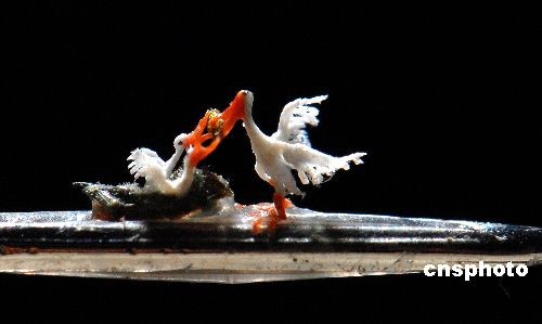 圖為臺灣著名微雕家陳逢顯的新作“母愛真情”。放在針孔上,只有小沙粒那么大。陳逢顯說,這是他應(yīng)大陸微雕界人士的邀約,為慰問汶川大地震受災(zāi)同胞而作。中新社發(fā) 陳立宇 攝