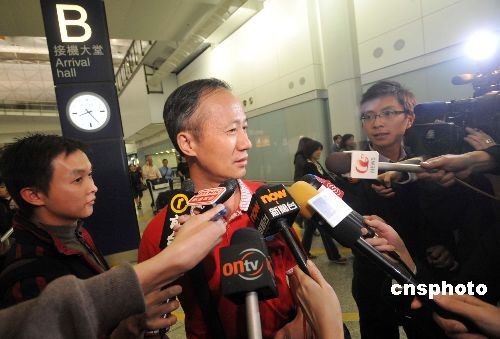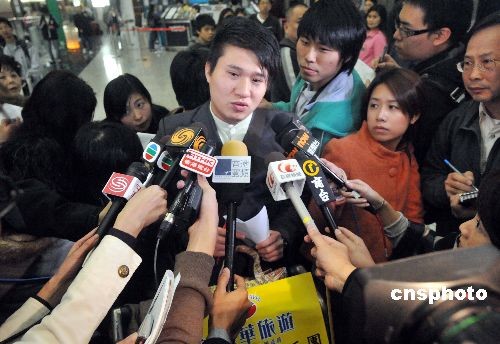 圖為乘坐專機(jī)返港的乘客張先生在機(jī)場(chǎng)接受媒體訪問。