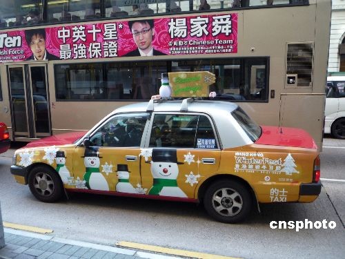 2008年12月20日,香港尖沙咀彌敦道出現“圣誕的士”。隨著圣誕節的臨近,香港一些出租車在車外殼畫上圣誕圖畫,烘托香港圣誕節氛圍。中新社發 姜純 攝