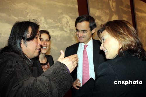 法籍華人畫家嚴培明個人畫展《蒙娜麗莎的葬禮》二月十一日晚在巴黎盧浮宮博物館德農廳揭幕。圖為嚴培明(左)在畫展揭幕式上與法國藝術界人士交流。中新社發 吳衛中 攝
