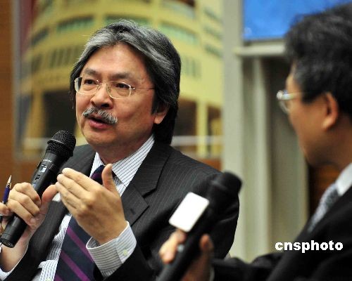 三月三日,香港特區(qū)財政司司長曾俊華,在浸會大學與學生舉行座談會,討論財政預(yù)算案。中新社發(fā) 譚達明 攝