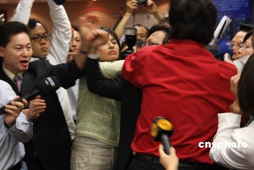 四月二十二日上午,臺灣“立法院內政委員會”邀請“陸委會”主委賴幸媛、海基會秘書長高孔廉等人報告即將舉行的第三次“陳江會談”。據臺灣中央社報道:中國國民黨籍“立委”李慶華在進行程序發言時,民進黨籍“立委”邱議瑩在臺下表達不滿意見,引發李慶華不滿,要邱議瑩“有點家教”,邱議瑩(左四穿白衣女性)與李慶華(穿紅衣男性)爆發口角,并突然從后面打李慶華一巴掌。李慶華下午到臺北地檢署,按鈴控告邱議瑩傷害及公然侮辱罪。圖為本社記者在“立法院”采訪時拍攝到的情景。中新社發 耿軍 攝