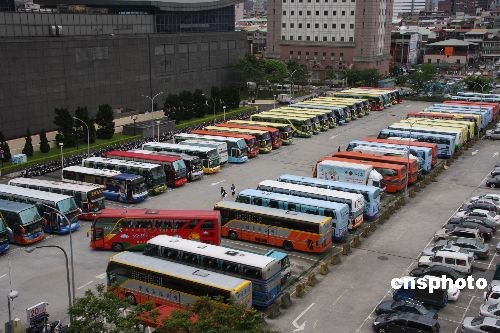從今年三月起,到臺(tái)灣的大陸游客驟增,日抵人數(shù)甚至突破七千人。以大陸游客在臺(tái)灣停留六至十天計(jì),每天停留在臺(tái)灣的大陸游客有數(shù)萬(wàn)人,以致游覽車不夠用。圖為在大陸游客參觀點(diǎn)臺(tái)北101大樓的附近停車場(chǎng)停滿旅游團(tuán)車輛。臺(tái)灣觀光局四月二十六日緊急研商決定,供大陸游客使用的游覽車車齡由七年放寬到十年,以增加一千三百六十輛游覽車緩解車輛不足。中新社發(fā) 耿軍 攝