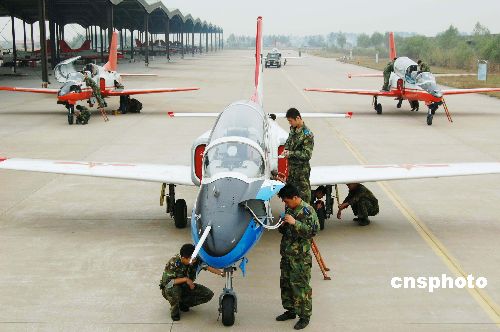 圖為10月22日,濟空某飛行學院飛行訓練現場一組鏡頭。擔負培養和造就高素質新型飛行人才重任的濟空某飛行學院,在飛行人員中開展“一心一意跟黨走、苦練精飛謀打贏”的主題活動,在機務和后勤官兵中開展“立足本職作貢獻、再接再厲立新功”為主題的崗位練兵和安全競賽活動,把學習十七大精神的政治熱情轉化到“牢記使命責任,苦練打贏本領”的具體行動中。中新社發 耿國慶 攝