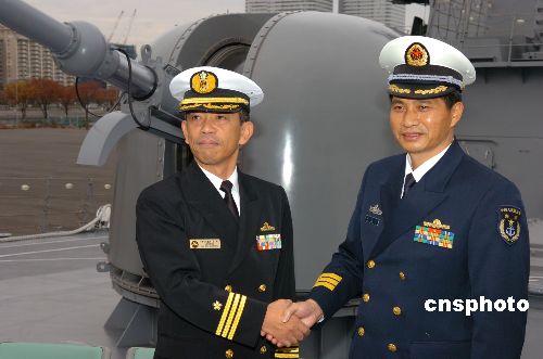 圖為中國海軍“深圳號”艦長朱建達上校在參觀日方107號護衛艦后,與護衛艦宮崎艦長握手。