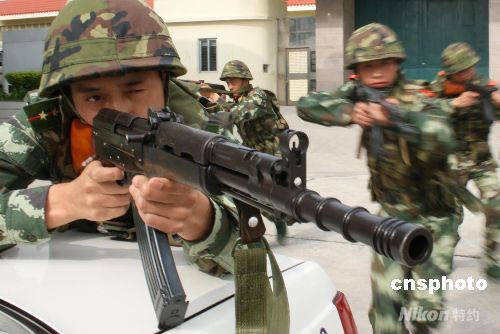 5月10日,武警福建總隊泉州支隊反恐分隊進行了一場以奧運圣火受到干擾和遭到破壞為背景的實戰(zhàn)演練,為奧運圣火在福建順利傳遞提供安全保障。圖為反恐分隊的武警官兵們正在進行“反騷亂”演練。中新社發(fā) 張九強 攝