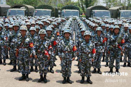 5月14日13時,中國南海艦隊海軍陸戰隊某旅搶險救災部隊第一梯隊760名官兵緊急起程奔赴四川汶川地震災區。第一梯隊的760人采取摩步化機動方式行進,預計48小時后抵達汶川災區。中國南海艦隊海軍陸戰隊將累計出動官兵2500名。中新社發 李唐 攝