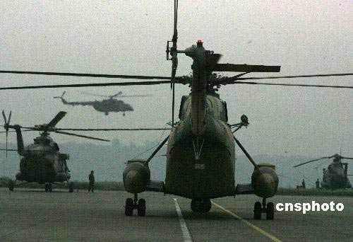 五月二十日,中央軍委調(diào)集四川省的四十一架軍方直升飛機(jī)轉(zhuǎn)場,飛抵離災(zāi)區(qū)最近的綿陽國際機(jī)場,爭分奪秒赴災(zāi)區(qū)救援。中新社發(fā) 賈國榮 攝