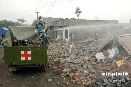 5月下旬,海軍衛生防疫消殺突擊分隊的防疫車對四川地震災區民房進行預防性消毒。截至到5月30日上午,由86名專業隊員組成的衛生防疫消殺突擊分隊已完成對四川綿竹、什邡等地震重災區60多個市區街道、村莊的廢墟、房舍、疑似疫源地等場所進行衛生防疫和消毒殺菌,有效地控制了災區的疫情隱患。中新社發 李唐 攝