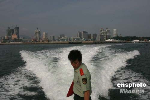 北京奧運會開幕時間日益臨近,青島邊防支隊駐奧帆中心官兵加緊訓練備戰奧帆賽安保。第29屆奧運會帆船帆板比賽將于2008年8月9日至21日在青島國際帆船中心及周邊水域舉行。圖為武警官兵在比賽場地巡邏。中新社發 王瑤 攝