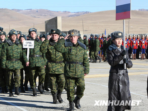 11月8日,蒙古國和俄羅斯聯合維和軍演在蒙中部的中央省正式開始。這次軍演為期30天,在蒙中部的中央省和北部的鄂爾渾省進行,是蘇聯解體后蒙俄兩國首次舉行聯合軍演。蒙俄共有700名官兵參加演習,其中450名為俄方官兵。 新華社記者郝利鋒攝